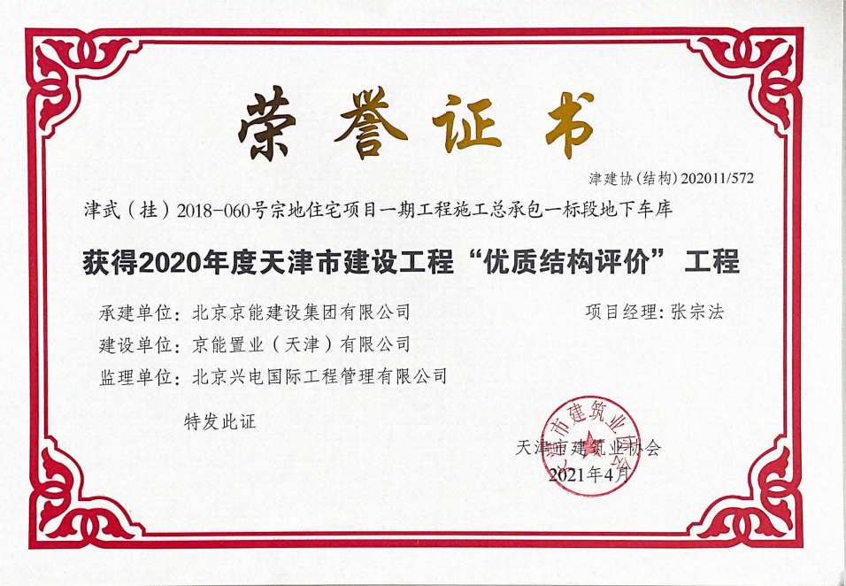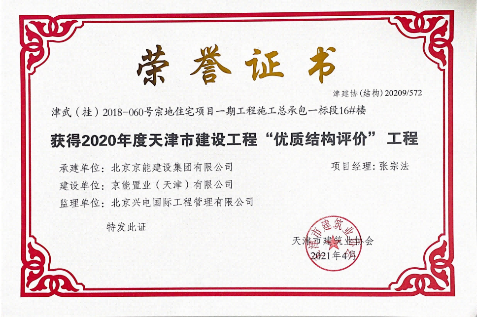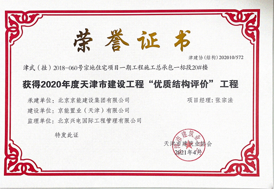 京能·雍清丽苑项目一期一标段获得2020年度天津市建设工程“优质结构评价”工程